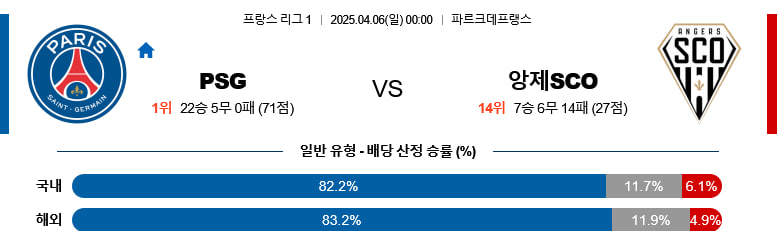 04/06(일) 파리생제르맹(PSG)vs앙제SCO 리그앙 분석