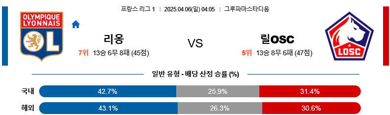 04/06(일) 올림피크리옹vs릴OSC 리그앙 분석