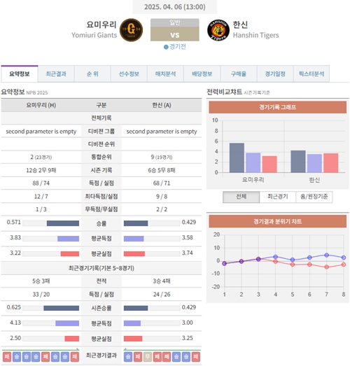 4월 6일 일본야구(NPB) 요미우리 VS 한신 [분석,추천]