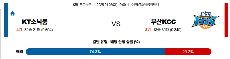 수원 KT는 직전경기(4/5) 원정에서 대구 한국가스공사 상대로 74-83 패배를 기록했으며 이전경기(4/3) 원정에서 울산 현대모비스 상대로 71-91 패배를 기록했다. 5연승이 중단 되는 패배가 나온 이후 2연패에 빠졌으며 리바운드(29-42), 3점슛(9개 -10개), 턴오버(7-15)의 결과. 허훈(22득점)이 분전했지만 상대에게 점수를 너무 쉽게 내줬고 수비에서 안 풀리다보니 공격도 무리한 플레이가 많이 나온 경기. 리바운드에서 밀리는 가운데 데릭 컬버가 레이션 해먼즈의 휴식 구간에 외국인 선수 매치업에서 밀렸던 상황. 정규시즌 홈경기에서는 2연승 성적.
