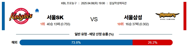 서울SK는 연속경기 일정이였던 직전경기(4/6) 홈에서 고양 소노 상대로 71-96 패배를 기록했으며 이전경기(4/5) 원정에서 안양 정관장 상대로 76-81 패배를 기록했다. 3연패 흐름 속에 리바운드(32-45), 3점슛(12개 -15개), 턴오버(13-10)의 결과. 안영준(17득점), 자밀 워니(15득점)가 분전했지만 정규리그 1위를 확정한 이후 모든 주전 자원들의 출전 시간을 조정하는 선수 운영을 보였고 투지와 마지막 집중 싸움에서 밀린 경기. 승부처에 경기에 대한 집중도가 떨어졌고 상대의 2대2 공격에 대한 수비에 헛점을 노출한 상황. 정규시즌 홈경기에서는 20승6패 성적.