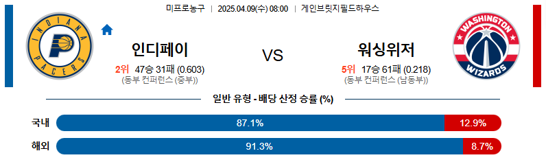 다음날 홈에서 필라델피아를 만나는 일정을 위해서 힘을 분산해야 하는 워싱턴의 패배가 예상되는 경기. 덴버를 상대로 맞대결 9연패에서 벗어난 인디애나는 플레이오프 1라운드 홈코트 어드밴티지를 확보하기 위해서 아직 승리가 더 필요하다. 다만, 파스칼 시아캄이 부상이고 일부 핵심 자원에게 휴식을 부여할 가능성이 높은 만큼 핸디캡 범위는 너무 과하다고 생각된다.