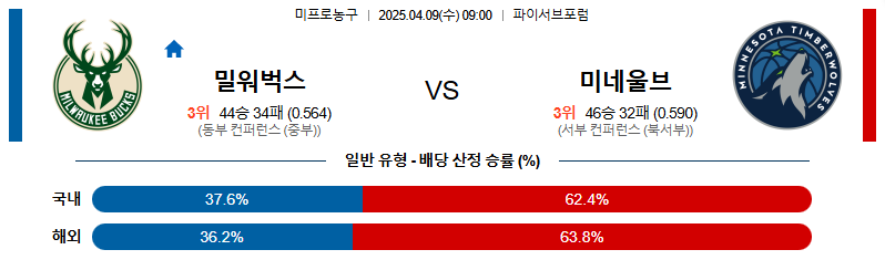밀워키는 핵심 전력이 되는 바비 포르티스가 금지약물 복용으로 출장정지 처분을 받고 있는 가운데 데미안 릴라드가 결장하며 야니스 아데토쿤보의 출전 여부가 불투명 하다. 네소타가 제공권을 장악할 것이며 앤써니 에즈워즈의 야투도 터질 것이다.