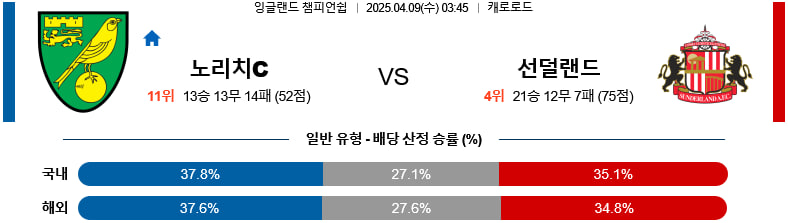 노리치는 전개력은 유지하고 있으나 핵심 수비 부재로 인해 실점 가능성이 계속 이어지고 있다. 선더랜드는 수비 조직력 유지와 전방의 빠른 마무리를 통해 원정에서도 충분히 흐름을 가져올 수 있다. 양 팀의 밸런스와 흐름을 감안하면 노리치가 수세에 몰릴 가능성이 높다.