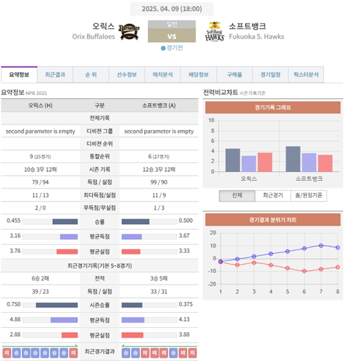 4월 9일 일본야구(NPB) 오릭스 VS 소프트뱅크 [분석,추천]