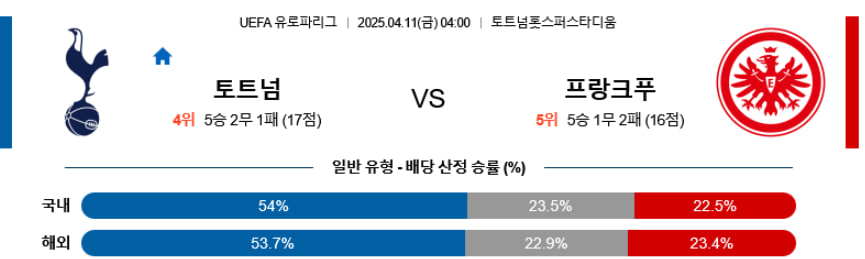 토트넘의 홈 경기력은 유로파 무대에서도 여전히 강하며, 손흥민(FW) 중심의 전방 전환과 매디슨(MF)의 2선 설계 능력은 프랑크푸르트의 미숙한 수비와 골키퍼 부재를 공략할 수 있는 강력한 무기가 된다. 반면 프랑크푸르트는 전방 압박과 측면 전개로 기회를 만들 수 있지만, 수비 안정성이 현저히 떨어지는 상황에서 고득점 양상으로 이어질 가능성이 높다. 결국 다득점의 흐름 속에서 토트넘이 근소하게 우위를 점할 것이다.