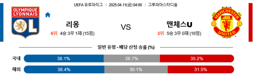 리옹의 승리가 유력하다. 홈에서의 화력과 상승세, 전방 셰르키(AMF)와 라카제트(FW)의 폼이 맨유 수비진의 허점을 효과적으로 공략할 수 있다. 반면, 맨유는 유로파리그에서 비교적 강한 모습을 보였지만, 지속되는 부상 이슈와 전방 결정력 저하로 인해 고전할 가능성이 크다. 수비는 일정 수준 유지되겠으나, 공격 전개에서의 정체로 인해 결국 리옹이 근소하게 승리를 가져갈 것으로 보인다.