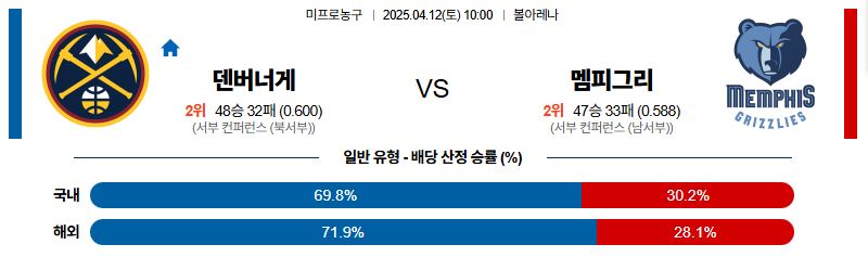 현재 덴버는 정규 시즌 2경기를 남긴 상태에서 LA 클리퍼스와 함께 서부 4번 시드로 동률을 이루고 있다. 반면, 멤피스는 이제 잔여 2경기에서 모두 승리를 기록하고 골든스테이트가 2경기중 1경기에서 패배를 당해야 6번 시드를 확보할수 있다. 덴버의 우세가 예상되며 언더 경기다.