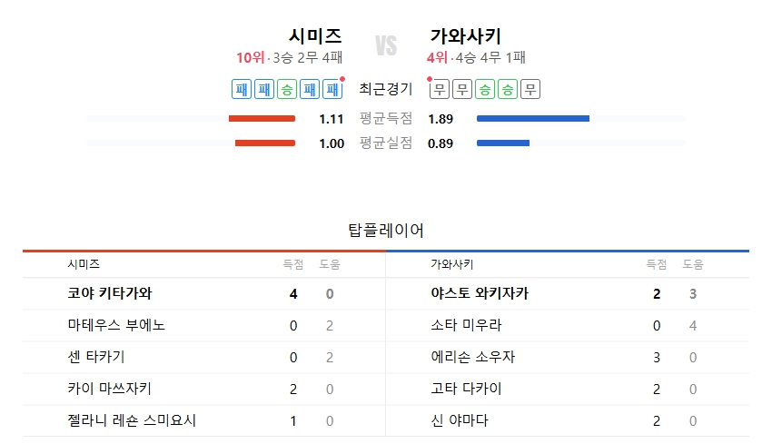 시미즈는 공격 전개와 전방 움직임은 나쁘지 않지만 결정력에서 한계를 보이고 있으며, 수비 조직도 여러 불안 요소가 존재한다. 반면, 가와사키는 수비 불안에도 불구하고 와키자카(MF)를 중심으로 한 중원의 전진성과 세트피스를 통한 해결 능력에서 차별점을 보이고 있다. 양 팀 모두 실점 가능성이 높은 흐름 속에서 난타전 양상이 예상되며, 득점 루트의 다양성과 후반 집중력에서 앞선 가와사키가 한 골 차 승리를 거둘 가능성이 크다.