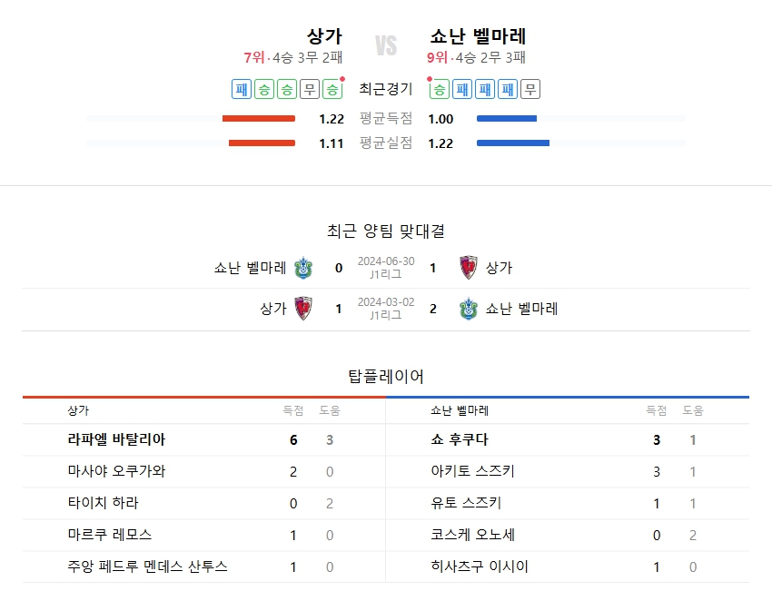 교토 상가는 엘리아스(FW)를 필두로 한 공격 전개가 절정의 컨디션에 도달했으며, 하라(FW), 후쿠오카(MF)와의 연계 속도도 빠르다. 반면 쇼난은 후반 체력 저하와 벤치 자원 깊이에서 열세를 보이고 있어, 후반 승부에서 밀릴 가능성이 높다. 전술 구조상 엘리아스를 막아내지 못할 경우 수비 뒷공간 노출이 반복될 수 있다. 전체적으로 교토의 공격력이 우세한 만큼, 다득점 양상의 홈 승리가 유력하다.
