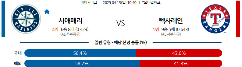 TEX : 쿠마 락커(1패 7.88)가 시즌 첫 승에 재도전한다. 7일 탬파베이와 홈 경기에서 5이닝 6안타 1실점의 투구를 보여준 락커는 시즌 첫 등판의 고전을 극복한 모습을 보여주었다. 삼진을 잡지 않기 시작하면서 오히려 투구 내용이 좋아졌는데 작년 시애틀 원정에서 4이닝 1실점으로 잘 던진 기억을 다시 꺼내들수 있느냐가 관건이다.