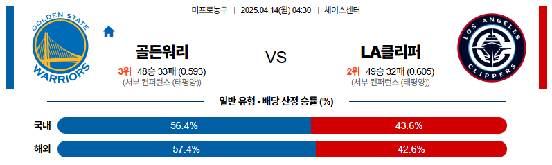 이제 남은 1경기를 모두 이기면 다른 팀 결과와 무관하게 자력으로 플레이오프 직행 티켓을 확보하게 되는 골든스테이트와 덴버와 함께 서부 4번 시드로 동률을 이루고 있는 LA클리퍼스의 진검 승부가 펼쳐진다. 승부처에 일선 압박후 기동에 의한 속공이 위력을 발휘되는 LA클리퍼스의 모습을 기대해도 좋은 경기다.