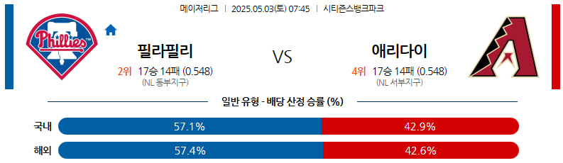현재 애리조나 최대의 문제는 좌완 상대로 전혀 힘을 쓰지 못하고 있다는 점이다. 원정임을 고려한다면 반등을 기대하긴 쉽지 않은 편. 그러나 전날 로드에게 고전한 필라델피아 역시 로드 워리어인 메릴 켈리 공략은 쉽지 않을 것이다. 결국 불펜전인데 이러니저러니 해도 애리조나는 불펜이 여전히 아쉽고 이 점이 승부를 가를 것이다. 후반에 강한 필라델피아 필리스가 신승을 가져갈 것이다.