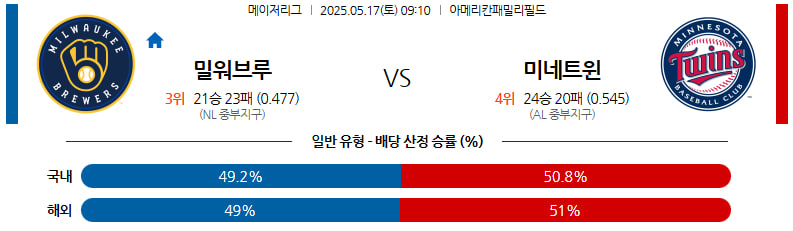 05월 17일 MLB 밀워키 미네소타 MLB분석