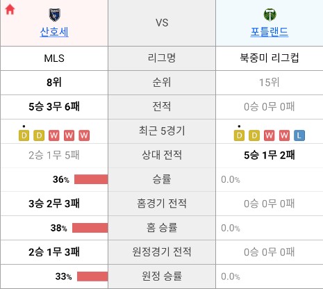산호세는 홈에서 강한 공격력과 안정된 빌드업을 기반으로 최근 상승세를 이어가고 있다. 주드(FW)와 케이(MF)의 전방 연계, 리마-마리의 측면 활용은 포틀랜드 수비진의 전환 약점을 공략하기에 적절하다. 반면 포틀랜드는 체력 저하와 중원 압박에 취약한 구조로, 산호세의 템포와 압박 전개에 대응하기 어려울 수 있다. 전술 완성도와 홈 경기력을 고려할 때 산호세가 근소한 우세를 보일 가능성이 높으며, 양 팀 모두 측면과 전환 중심의 공격을 전개하는 만큼 다득점 양상도 예상된다.