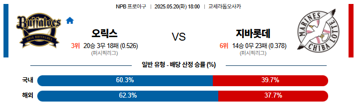 12회말 사요나라 승리로 마무리 되긴 했지만 현재 치바 롯데의 경기력이 좋다는 말은 빈발로도 할수 없는 레벨이다. 원정에서 쿠리를 공략하는건 상당히 힘들듯. 그러나 이시카와 역시 야간 경기라면 조금 기대를 걸 여지는 있는 편. 그러나 여전히 치바 롯데는 후반 전개에 심각한 약점을 가지고 있고 결국 이 점이 승부를 가를 것이다. 홈의 잇점을 가진 오릭스가 신승을 거둘 것이다.