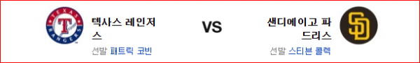 최근의 텍사스는 연장 필패라는 표현이 어울리는 모습을 보여주고 있다. 즉, 후반으로 갈수록 불리하다는 이야기. 콜렉은 한번 기세를 타면 이어갈수 있는 투수고 샌디에고는 불펜에서 우위를 잡고 있다. 물론 코빈이 인터리그 투구가 좋다는 강점이 있긴 하지만 샌디에고 역시 좌완에게 녹록한 팀은 아니다. 상성에서 앞선 샌디에고 파드레스가 신승을 가져갈 것이다.