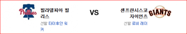 전날 경기는 선발 투수들은 제 몫을 해냈지만 결국 불펜에서 승부가 갈린 경기였다. 이번 경기는 이야기가 다를듯. 직전 등판에서 로비 레이의 투구는 완벽했고 홈이라는 강점도 갖추고 있다. 반면 선발로서의 워커는 기대가 되지 않는게 엄연한 현실이고 전날 필라델피아의 불펜은 제 몫을 전혀 하지 못했다. 선발에서 앞선 샌프란시스코 자이언츠가 승리를 가져갈 것이다.