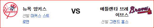 전날 경기는 애틀랜타에게 있어서 그야말로 악몽이었다. 반면 양키스는 오래간만에 양키스 다운 경기력을 보여주었다고 할수 있을듯. 그러나 양키스는 원정에서 페이스를 계속 이어가는 팀은 아니고 홈즈는 낮 경기 강점은 확실한 투수다. 반면 지금의 스트로만에게 기대를 걸긴 쉽지 않다. 선발에서 앞선 애틀랜타 브레이브스가 승리를 가져갈 것이다.