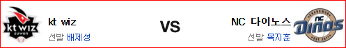 NC는 목지훈(3승 4패 5.81) 카드로 스윕 저지에 나선다. 8일 삼성과 홈 경기에서 2.2이닝 4실점의 부진한 투구를 보여준 목지훈은 3경기 연속 호투가 없는 특징을 여지 없이 보여준바 있다. KT 상대로 이번 시즌 2번의 호투와 1번의 부진을 보여주었는데 첫 홈 경기라는 점이 변수가 될수 있다. 전날 경기에서 패트릭과 김민수 상대로 단 2점을 올리는데 그친 NC의 타선은 홈에서 타선의 집중력이 전혀 살아나지 못하고 있는 중이다. 1차전 1회말 찬스 무산 이후 완전히 타격이 침묵해버렸다고 해도 좋을 정도. 5이닝을 1실점으로 버틴 불펜은 조민석이 혼자 4이닝을 버텨준게 정말로 다행일 것이다.