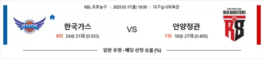 2025년 3월 17일 KBL 경기에서 한국가스는 안양정관을 상대로 승리할 가능성이 높습니다.