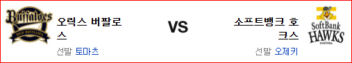 오릭스 버팔로스는 토마츠 카이세이(9.00)가 데뷔 첫 1군 선발 마운드에 오른다. 1군 데뷔전이었던 19일 치바 롯데 원정에서 2이닝 2실점의 투구를 보여준 토마츠는 포심-슬라이더의 단조로운 투구 패턴이 실점으로 연결된 바 있다. 오릭스가 토마츠를 선발로 내세운건 우투수지만 좌타자에게 강한 타입인지라 좌타자가 많은 소프트뱅크를 노린 자객 선발로 보여진다. 전날 경기에서 아리하라와 마츠모토 상대로 나카가와의 솔로 홈런 포함 3점을 올린 오릭스의 타선은 일단 첫 단추는 잘 끼웠다는데 만족해야 할듯. 3회초의 2득점도 상당히 운이 따라주었음을 잊어선 안된다. 2.2이닝동안 7실점을 허용한 불펜은 혼다 케이스케를 다시 2군으로 보내야 할것 같다.