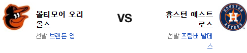 양 팀 모두 주중 시리즈의 타격이 좋다고 하긴 힘든 편이다. 그만큼 투수들의 역할이 중요한 편. 하지만 발데즈는 홈에서 강한 투수인데다가 볼티모어 타선은 좌완만 만나면 맥을 못추는 타선이다. 게다가 이동의 여파도 있고 영의 원정도 문제다. 전력에서 앞선 휴스턴 애스트로스가 승리를 가져갈 것이다.
