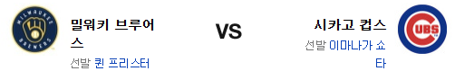 컵스의 3연승. 하지만 밀워키의 타격 부진이 더욱 더 크게 느껴지는 시리즈다. 보이드, 레이의 투구를 고려한다면 이마나가 역시 이번 경기에서 기대를 걸 여지가 있는 편. 프리스터 역시 이번 경기에서 좋은 투구를 할 가능성이 높은 편이다. 이번 경기 역시 접전의 가능성이 있는데 컵스는 불펜의 피로도가 급격하게 높아진 상태고 전날 밀워키는 승리조를 아꼈다. 후반에 강한 밀워키 브루어스가 신승을 가져갈 것이다.