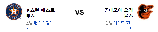 휴스턴 애스트로스는 랜스 맥컬러스 주니어(2승 4패 6.90)가 부상에서 복귀전을 치른다. 7월 20일 시애틀 원정에서 2.2이닝 4실점의 부진한 투구를 보여준 뒤 물집이 터져서 아웃 되었던 맥컬러스는 한달여만에 복귀전을 치른다. 이번 시즌 홈에서 부진하고 원정에서 강한 특징이 이어진다는 점은 그를 이번 경기에 등판시킨 이유이기도 할 것이다. 전날 경기에서 브랜든 영에게 복수전을 해내면서 홈런 2발 포함 7점을 올린 휴스턴의 타선은 주중 시리즈의 부진을 훌륭하게 타개했다는 점이 고무적이다. 특히 캠든 야드에서 홈런포로 이겨냈다는 점은 시사하는 바가 크다. 3.2이닝을 1안타 무실점으로 막아낸 불펜은 아직까진 헤이더의 부재가 보인다.