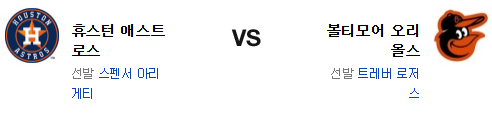 휴스턴 애스트로스는 스펜서 애리게티(1승 4패 6.94)가 시즌 2승에 도전한다. 19일 디트로이트 원정에서 5이닝 5실점의 부진으로 패배를 당한 애리게티는 원정 부진의 문제를 전혀 극복하지 못하는 중. 게다가 원정 낮 경기는 그가 제일 싫어하는 전장임을 생각해야 한다. 전날 경기에서 크레이머와 엔스를 공략하면서 홈런 4발 포함 8점을 올린 휴스턴의 타선은 홈런으로만 8점을 올린게 상당히 컸다. 이번 시리즈는 캠든 야드 적응력이 상당히 좋은 편. 그러나 7이닝동안 3실점을 허용한 불펜은 확실히 흔들리는 중.