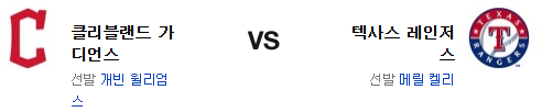 이번 시리즈에서 텍사스는 최소한 위닝 시리즈를 확보했다. 텍사스는 승률 5할을 위해, 클리블랜드는 5할이 깨지지 않기 위한 경기가 될듯. 이 경기가 낮 경기임을 고려한다면 켈리와 윌리엄스의 대결은 막상막하다. 이번 경기는 후반 불펜 싸움인데 그 점에선 그래도 클리블랜드가 조금 더 낫다. 불펜에서 앞선 클리블랜드 가디언스가 신승을 가져갈 것이다.