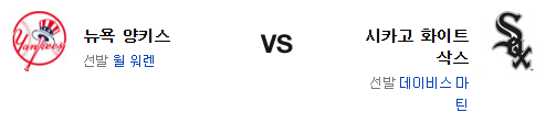 뉴욕 양키스는 윌 워렌(7승 6패 4.47)이 시즌 8승에 도전한다. 24일 보스턴과 홈 경기에서 4이닝 5실점의 부진한 투구를 보여준 워렌은 홈 강점이 나라갔다는 점이 치명적이다. 홈에 비해 원정 손색이 있다는건 홈에서 강한 화이트삭스 상대로 고전 가능성이 존재한다는 이야기다. 전날 경기에서 카발리와 오가사와라를 공략하면서 홈런 6발 포함 11점을 올린 양키스의 타선은 홈런으로만 9점이라는 홈런 군단의 모습을 보여주었다. 지금의 파워는 가히 놀라울 정도. 폴 블랙번이 혼자서 2이닝을 처리해준것도 다행스럽다.
