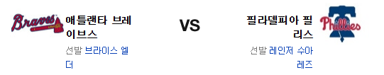 전날 경기는 그야말로 필라델피아의 홈런 파티였다. 이 흐름을 이어가긴 쉽지 않을듯. 엘더가 원정에서 강한 투수라는건 이견의 여지가 없다. 하지만 수아레즈 역시 홈에서 페이스가 올라가고 있고 애틀랜타는 좌완 공략도가 영 떨어지는 편이다. 선발에서 앞선 필라델피아 필리스가 승리를 가져갈 것이다.