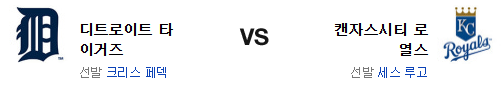 두 투수는 6일전 대결했고 패덱이 승리했다. 그러나 이번엔 루고의 홈이라는 점이 다른 부분. 게다가 캔자스시티의 타선 역시 홈에서 강점이 있는 반면 디트로이트의 타선은 최근 급격헤가 페이스가 가라앉고 있다. 선발에서 앞선 캔자스시티 로얄스가 승리를 가져갈 것이다.