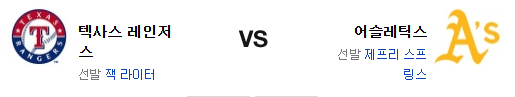 양 팀의 선발 투수들은 모두 최근 투구가 좋고 구장을 탄다는 공통점이 있다. 즉, 지금의 상황이라면 이번 경기는 타격전 가능성이 높은 편. 하지만 그 무너지는 강도는 라이터쪽이 훨씬 더 큰 편이고 텍사스 역시 최근 불펜의 허리는 좋다고 못한다. 홈의 잇점을 가진 애슬레틱스가 승리를 가져갈 것이다.
