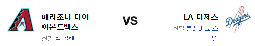 조금씩 다저스가 살아나고 있다. 물론 애리조나 역시 전날 연패를 극복하긴 했지만 이동 거리는 극복이 어렵고 스넬과 퀸타나는 완전히 다른 유형의 투수다. 갤런이 잘 버텨줘야 하지만 다저스와 궁합이 좋지 않은게 사실이고 애리조나의 불펜도 신뢰가 어렵다. 전력에서 앞선 LA 다저스가 승리를 가져갈 것이다.
