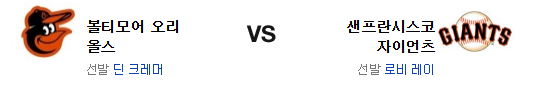 양 팀 모두 지금 타격이 좋다는 말은 절대로 할수 없는 레벨. 볼티모어 입장에선 크로셰 뒤에 레이는 또다시 고개를 젓게 할수 있다. 반면 샌프란시스코는 홈이라는 잇점이 있는 편이고 크레이머는 인터리그 궁합이 좋지 않은 투수다. 홈의 잇점을 가진 샌프란시스코 자이언츠가 승리를 가져갈 것이다.