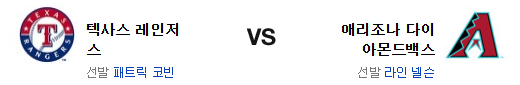 애리조나는 좌완에게 상당히 강한 팀이다. 직전 경기에서 좋은 투구를 해냈지만 원정에서 약한 코빈은 공략해낼수 있을듯. 물론 텍사스의 타격 역시 최근 좋다는건 부인할수 없지만 넬슨은 실질적인 에이스 역할을 하고 있고 전날 텍사스의 불펜 내용은 그다지 좋지 않았다. 상성에서 앞선 애리조나 다이아몬백스가 승리를 가져갈 것이다.