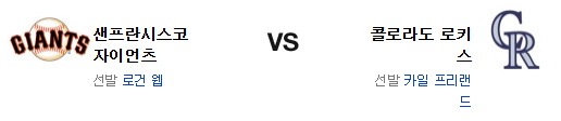 콜로라도는 득점력이 가라앉은 반면 샌프란시스코는 호조를 유지했다. 이 차이는 상당히 크다. 텡에게 막힌 콜로라도 타선은 이번 경기에서도 웹 상대로 고전 가능성을 배제할수 없을듯. 반면 샌프란시스코 타선의 집중력은 유지되고 있는 중. 좌완 상대 아쉬움이 있긴 하지만 장타력은 유지되고 있다. 전력에서 앞선 샌프란시스코 자이언츠가 승리를 가져갈 것이다.