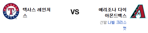 전날 경기에서 텍사스는 원정에서의 집중력은 차원이 다르다는걸 보여주었다. 이는 크리스맷 상대로도 어느 정도는 버텨줄수 있다는 이야기. 애리조나로선 얼마나 텍사스의 불펜을 공략할수 있느냐가 관건인데 의외로 텍사스의 차륜전은 보기보다 좋은 편이라는게 포인트. 애리조나의 불펜은 한번 무너지면 그야말로 대책이 없다. 기세에서 앞선 텍사스 레인저스가 승리를 가져갈 것이다.