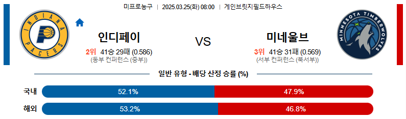 타이리스 할리버튼이 복귀한 인디애나의 우세가 예상되지만 미네소타가 승리를 가져간다고 해도 이변이라고 볼수 없다. 승패의 접근은 피하고 싶은 경기가 되며 231.5점의 기준점 된다면 언더 경기다.
