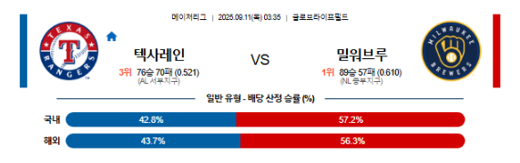 【MLB메이저리그】09월11일 텍사스 vs 밀워키 mlb 생중계,스포츠분석,스포츠중계