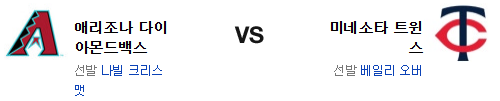 최근의 애리조나는 불펜 문제가 심각하다. 그걸 능가하는 타격과 선빌이 나와주느냐가 관건. 하지만 오버는 홈에서 강한 투수고 최근의 라이언보다는 오히려 투구가 더 나은 편. 반면 크리스맷은 원정 문제가 매우 심각한 투수다. 선발에서 앞선 미네소타 트윈스가 승리를 가져갈 것이다.
