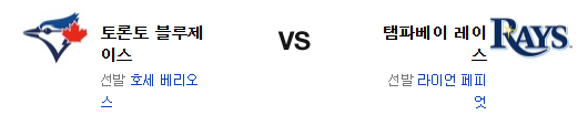 토론토 입장에선 그야말로 간신히 올린 승리였다. 그게 두 팀의 전력 차이라고 할수 있을듯. 하지만 전날 경기의 흐름을 고려한다면 페피옷 상대로 토론토 타선이 살아나긴 쉽지 않을듯. 반면 베리오스는 최근 투구의 기복이 심하고 이틀 연속 불펜이 폭발하진 않을 것이다. 선발에서 앞선 탬파베이 레이스가 신승을 가져갈 것이다.