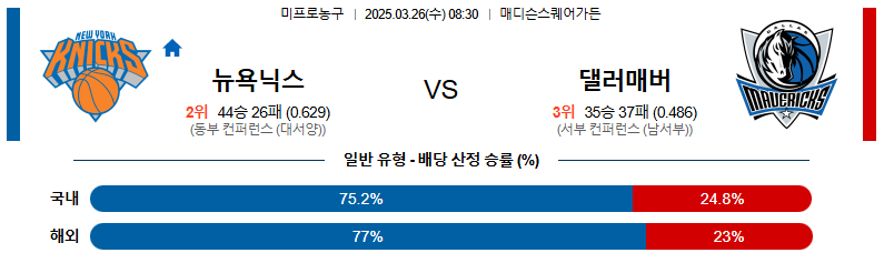 다음날 원정에서 LA클리퍼스를 만나는 일정을 위해서 힘을 분산해야 하는 뉴욕은 팀의 핵심 가드인 제일런 브런슨이 발목 부상으로 결장한다. 다만, 전일 부상 복귀전을 치른 앤서니 데이비스가 관리가 필요한 만큼 백투백 원정에서 쉬어갈 가능성이 높고 댈러스는 빅맨 전력이 부상 선수들이 많은 탓에 강하다고 볼수 없다. 뉴욕이 제공권을 장악하며 승리를 가져갈 것이다.