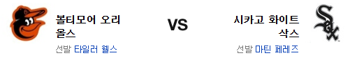 화이트삭스의 대추격은 실패로 끝났다. 그래도 타격이 살아났다는 점은 주목 포인트. 지금의 투구를 본다면 페레즈와 웰즈 모두 호투를 기대할 여지가 많지만 볼티모어가 좌완에게 상당히 강하다는 점, 그리고 전날 스미스가 무너진건 페레즈에게 불리하게 작용할수 있다. 볼티모어의 불펜 문제가 존재하는건 사실이지만 볼티모어에겐 아직 불펜의 여유가 있다. 상성에서 앞선 볼티모어 오리올스가 승리를 가져갈 것이다.