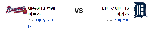 최근 디트로이트의 경기력은 빈말로도 좋다고 할수 없는 수준이다. 현재의 타격으로 원정에 강한 엘더 공략은 쉽지 않을듯. 반면 모튼은 홈과 원정 모두 투구가 좋다고 할수 없는 편이고 애틀랜타의 타격은 최근 페이스가 올라오고 있는 중이다. 게다가 불펜의 우위가 서서히 넘어가고 있다. 상성에서 앞선 애틀랜타 브레이브스가 승리를 가져갈 것이다.
