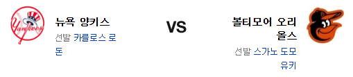 볼티모어 오리올스는 스가노 토모유키(10승 8패 4.39)가 시즌 11승 도전에 나선다. 14일 토론토 원정에서 6이닝 4안타 1실점의 호투를 보여준 스가노는 정말 오래간만에 원정 호투를 과시한 바 있다. 반면 최근 투구는 2경기 연속 4실점으로 좋지 않다는 점이 불안 요소고 피홈런이 너무 많다. 전날 경기에서 워렌과 힐 상대로 마운트캐슬의 솔로 홈런 포함 4점을 올린 볼티모어의 타선은 승리하긴 했지만 타격감 자체는 좋다고 할수 없는 편. 특히 득점권의 문제는 변하지 않고 있다. 3이닝동안 2실점을 허용한 불펜은 디트릭 엔스의 기복이 참으로 크다.