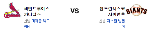 최근 세인트루이스의 고춧가루는 무서울 정도다. 샌프란시스코에겐 부담이 될수도 있을듯. 특히 맥기비가 원정 투구가 좋고 최근 샌프란시스코의 타격을 고려한다면 호투 가능성이 꽤 높다. 그러나 지금의 벌랜더는 그야말로 무적에 가깝고 불펜도 확실히 제 역할은 해내고 있다. 선발에서 앞선 샌프란시스코 자이언츠가 신승을 가져갈 것이다.