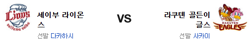 라쿠텐 골든 이글스는 사카이 하루토가 시즌 첫 1군 마운드에 오른다. 작년 단 1경기에 등판해 1이닝 무실점의 투구를 보여준 사카이는 이번 시즌 2군에서 꾸준히 선발로서의 수업을 쌓은 투수. 문제는 2군 방어율이 6.06에 피안타율 .318로 상당히 좋지 않았다는데 있다. 전날 경기에서 요자의 투구에 막혀 있다가 세이부의 불펜을 공략하면서 3이닝동안 7득점을 올린 라쿠텐의 타선은 막판 3이닝 7득점이 놀라울 정도. 특히 타이라를 공략하면서 9회말에 3점을 올린게 크다. 4이닝동안 4실점을 허용한 불펜은 역시 승리조 외엔 쓸 투수가 없다.